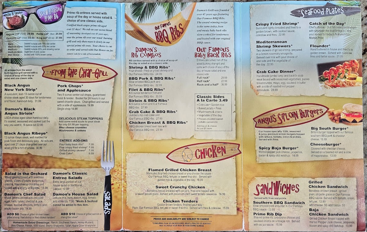 Typical menu highlights include comforting dishes like French Onion Soup, Pot Roast, and She-Crab Soup, alongside signature items such as Damon's Famous Onion Loaf and a variety of grilled meats. Burgers here range from simple cheeseburgers to more adventurous flavors like the Spicy Baja Burger topped with jalapenos and spicy chili ketchup.